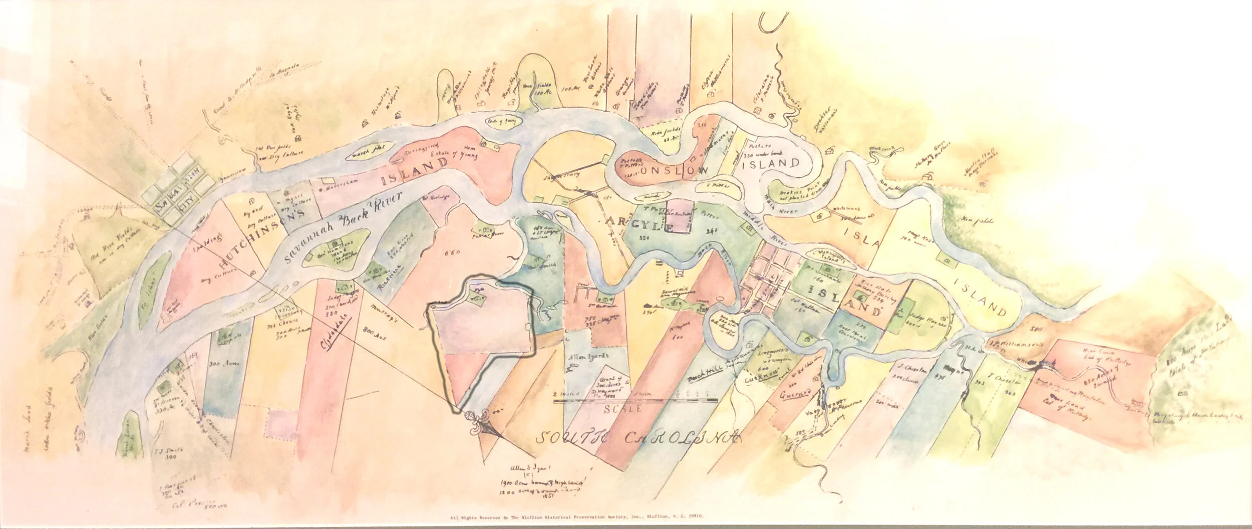 One plantation that is shown on the map, is Fife Plantation, where Daniel Heyward inherited land and waterway access to the Savannah River. The "back river," wound its way along the South Carolina border, creating Hutchinson's, Onslow, Argyle and Isla Islands; all perfect for growing rice. Some of the richest and most powerful men are noted as owners on the many plantations drawn on the document. According to the original drawing, many of the planters "owned homes in Oakatee", (then a half of a day's ride away), where they would have spent most of their time. Many hands were required to work the rice fields, and 251 enslaved workers are listed in the hand-written list of names, sexes, ages and work assignments. Note the drivers, cooks, children's nurses, field workers and do. (domestic house workers), on the list, some noted as having been brought from Heyward's Combahee plantation, near present-day Okatee.