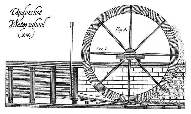 On the water's edge of each plantation, a green square indicates the location of the mill pond, where rice was gathered and milled for shipping. The location on the water provided more than the necessary transport by boat to market, it also provided the 'engine' that provided the power to mill the rice. An ingenious system that utilized hand-dug trenches, gates, and an undershot waterwheel, meant that during about four hours of the incoming tide, the power of the rushing water would spin the wheel. The gears and pulleys attached to the wheel transferred power indoors to the mill, where the rice was cracked and separated from the hull, before being bagged for shipment. During slack times when the tides were changing, the mill was silent, but when the tide changed and began to rush out, the gates were opened and the undershot wheel was back in action for another four hours of tidal action. Careful monitoring, and sometimes, 24-hour operation of the gates and mill made for demanding work.
